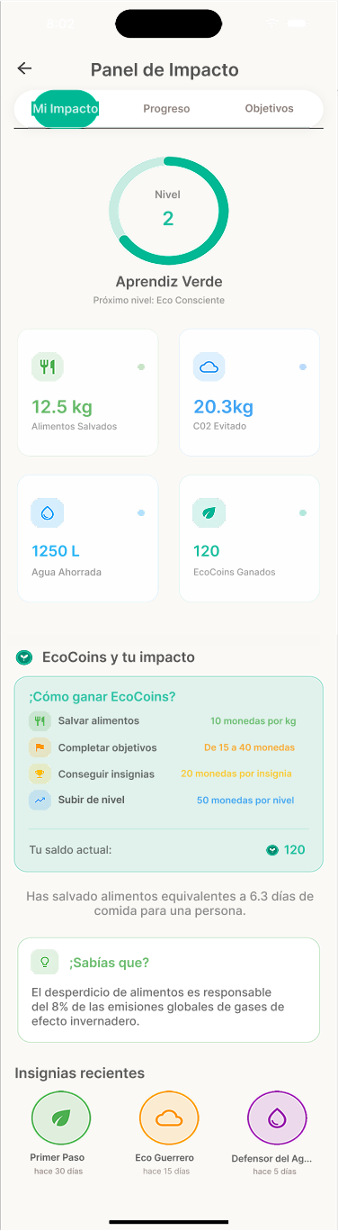Visualiza tu impacto ambiental positivo con métricas detalladas que muestran reducción de huella de carbono, ahorro de agua y logros de prevención de desperdicios.